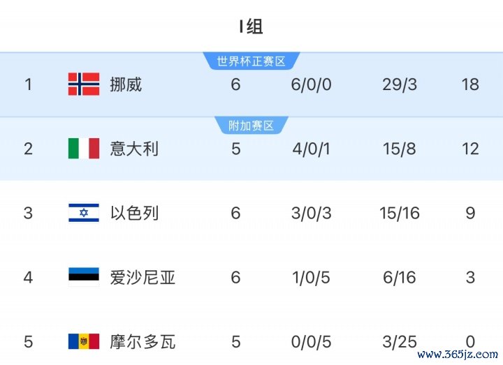 挪威6连胜以18分领跑I组,净胜球高达26个。意大利少赛一场过期挪威6分,净胜球为7个。
