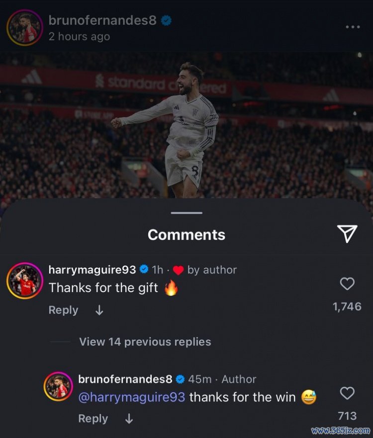 B费赛后社媒晒照庆祝见效,马奎尔留言:“谢谢你的礼物。”