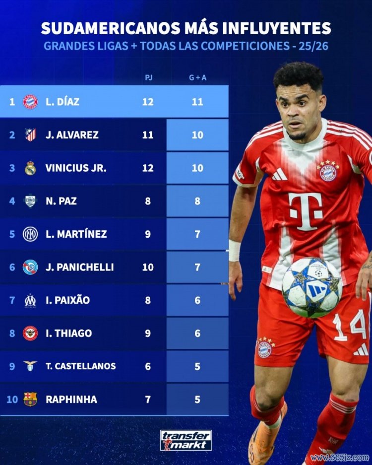 10月24日讯 德国转会市集统计了本赛季五大联赛南好意思球员的参与进球数目,并排出榜单,路易斯-迪亚斯参与11球居首,阿尔瓦雷斯、维尼修斯参与10球次席。