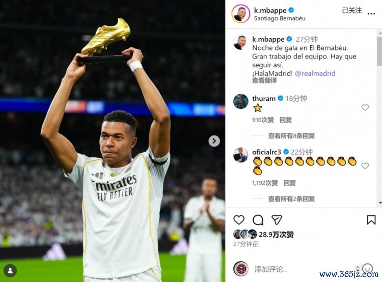 姆巴佩社媒晒出赛前展示欧洲金靴奖杯的相片,配文:“伯纳乌的华彩之夜,全队齐透流露色,咱们要不时保握!Hala Madrid!”