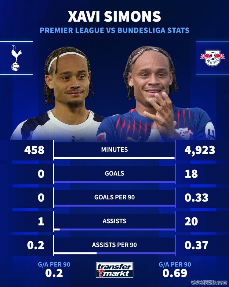 11月4日讯 德国转会商场统计了热刺新援哈维-西蒙斯在德甲和英超的数据,并作念出对比。