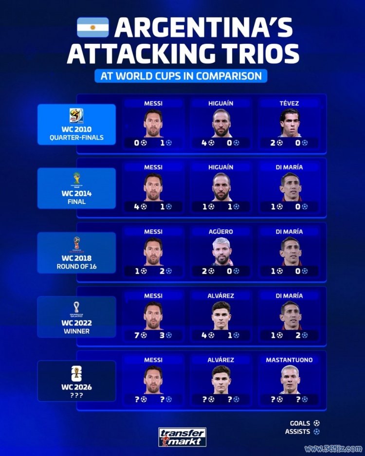 11月19日讯 德国转会市集列出了阿根廷队近5届天下杯的锋线三叉戟,并展望来岁天下杯梅西、阿尔瓦雷斯、马斯坦托诺在锋线搭档。