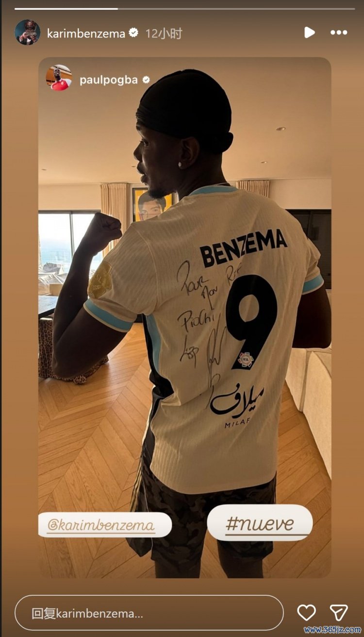 博格巴社媒晒照,他身穿本泽马签名球衣,并@本泽马,尔后者也转发了这一动态。
