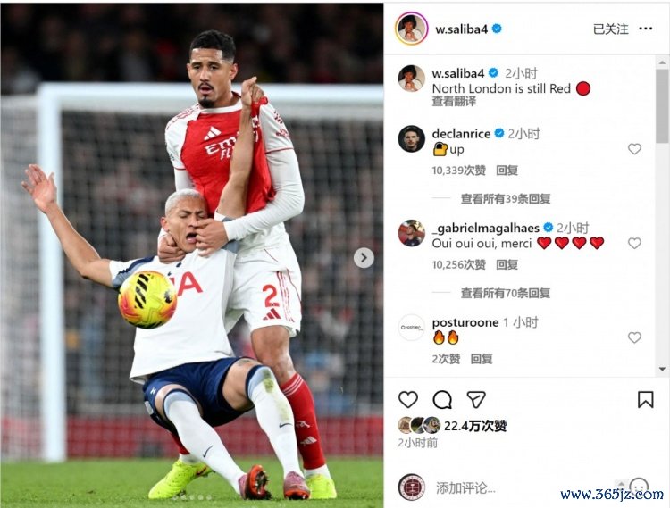 萨利巴社媒晒出精明里沙利松的相片,庆祝球队取胜,配文:“北伦敦照旧是红色的。”
