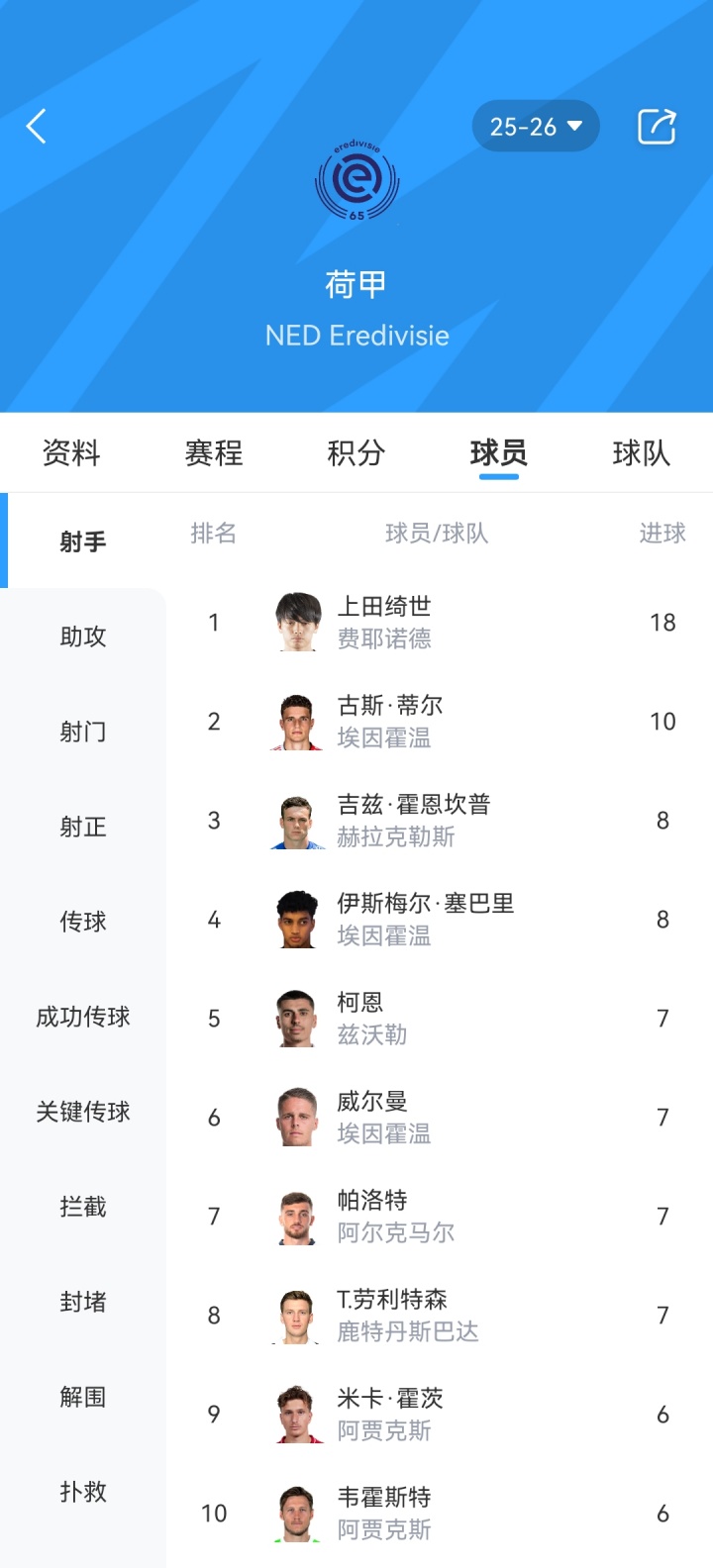 荷甲弓手榜上,上田绮世当今以18个进球遥遥超越,与第二名之间有八个进球的差距;此外他个东谈主的身价也来到1500万欧元,创造了个东谈主新高。