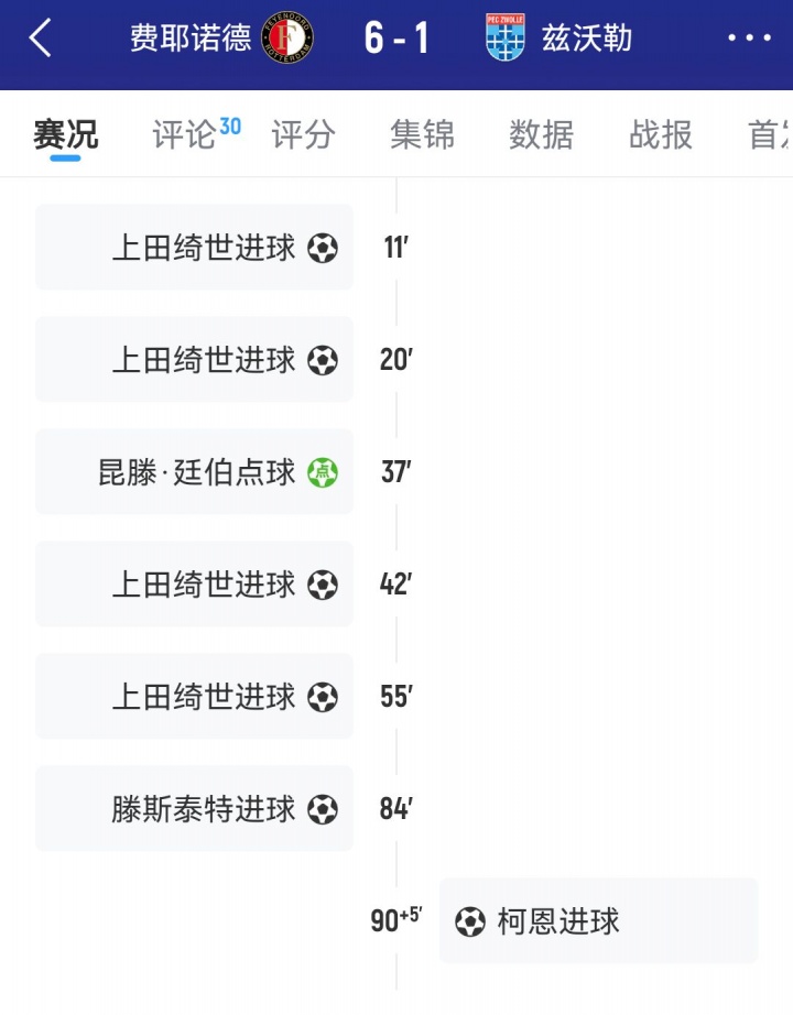 12月07日讯 荷甲第15轮,费耶诺德主场6-1横扫兹沃勒,27岁的日本时尚上田绮世头顶脚踢献艺大四喜,远隔在比赛的第11、20、42、55分钟破门,匡助球队赢得大捷。