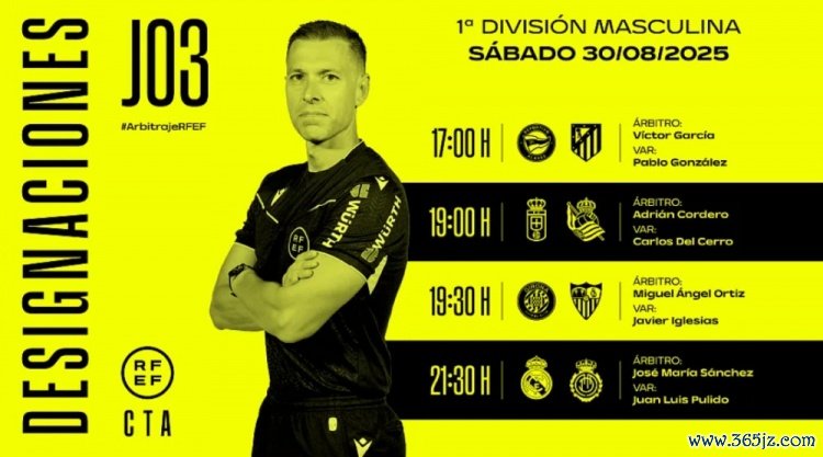 8月30日讯 西甲官方公布了当地时辰周六进行的4场西甲比赛的裁判安排,其中何塞-马里亚-桑切斯将王法皇马VS马洛卡。
