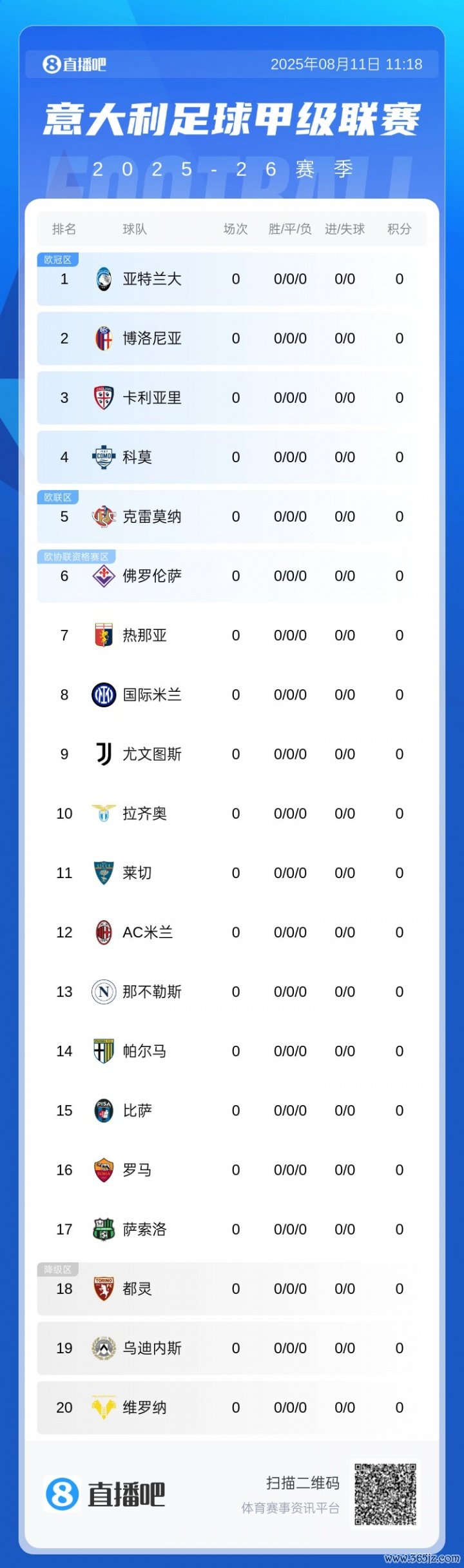 25/26赛季意甲20队:亚特兰大、博洛尼亚、卡利亚里、科莫、克雷莫纳、佛罗伦萨、热那亚、国外米兰、尤文图斯、拉皆奥、莱切、AC米兰、那不勒斯、帕尔马、比萨、罗马、萨索洛、都灵、乌迪内斯、维罗纳