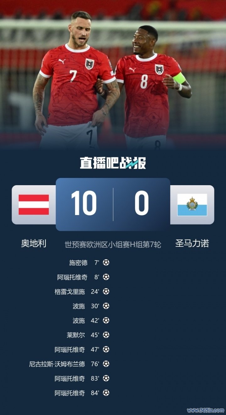 奥地利10-0狂胜圣马力诺,阿瑙托维奇大四喜。奥地利5连胜领跑H组;圣马力诺6连败、只进1球狂丢28球,排行倒数第一。