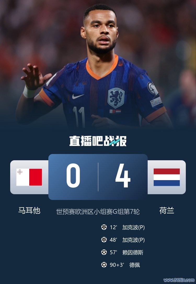 上半场赫拉芬贝赫造点,加克波点射闪击到手,下半场加克波点射完成双响,赖因德斯推射扩大比分,德佩替补立功,最终荷兰4-0马耳他三分领跑。