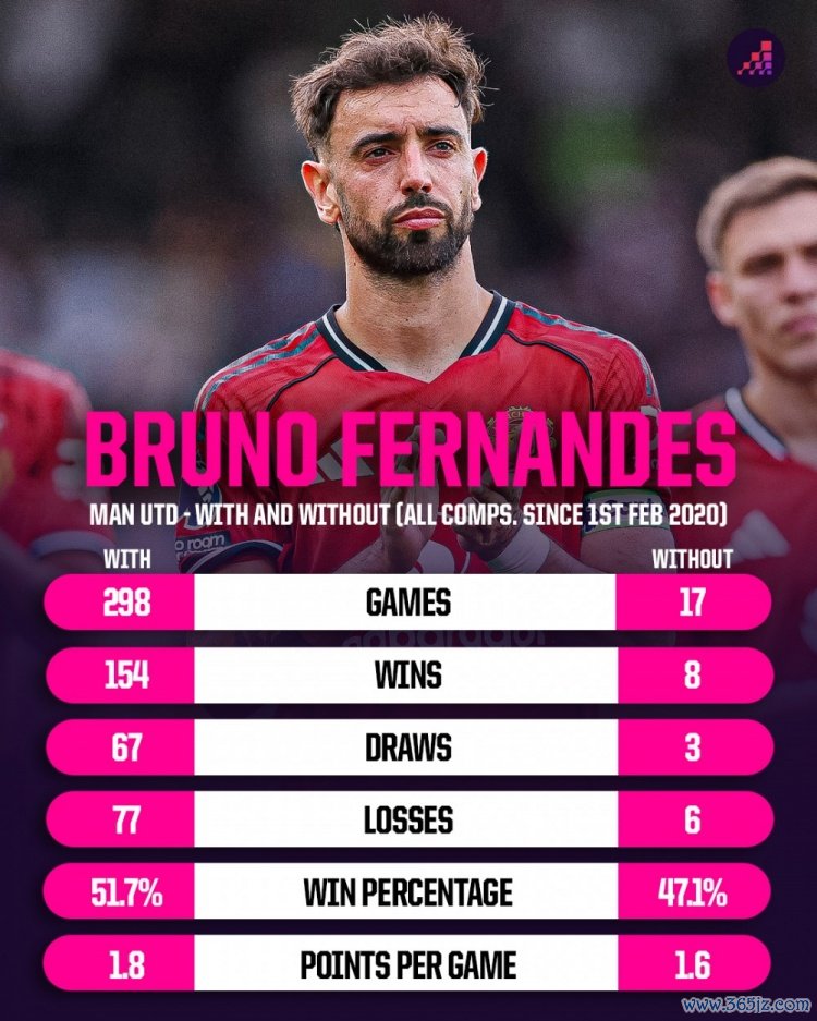 10月14日讯 Opta统计了B费加盟曼联以来出场、缺席情况下球队的战绩,并作念出对比。