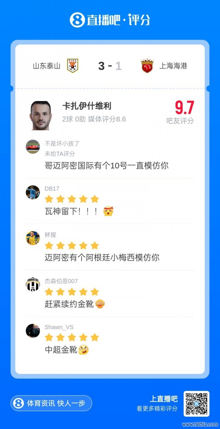 而卡扎伊什维利条约本年年底到期,于今莫得续约的音信,有多家中超球队对他虎视眈眈。在评分中,多位泰山球迷敕令留住他↓