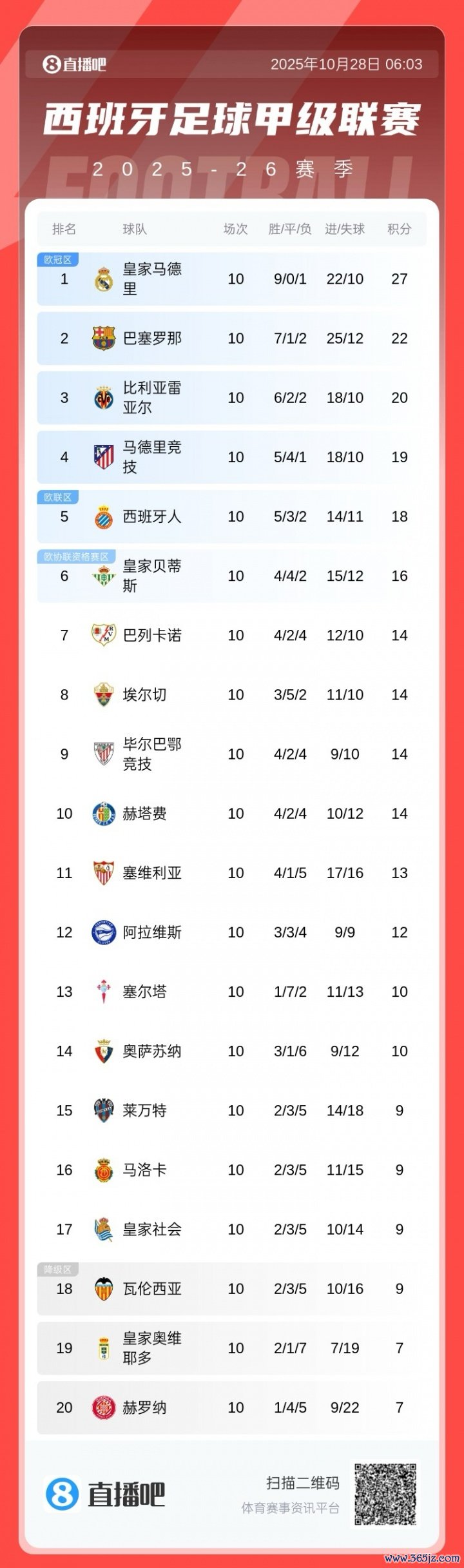 西甲积分榜:皇马10轮跳跃巴萨5分,黄潜第三,马竞第四