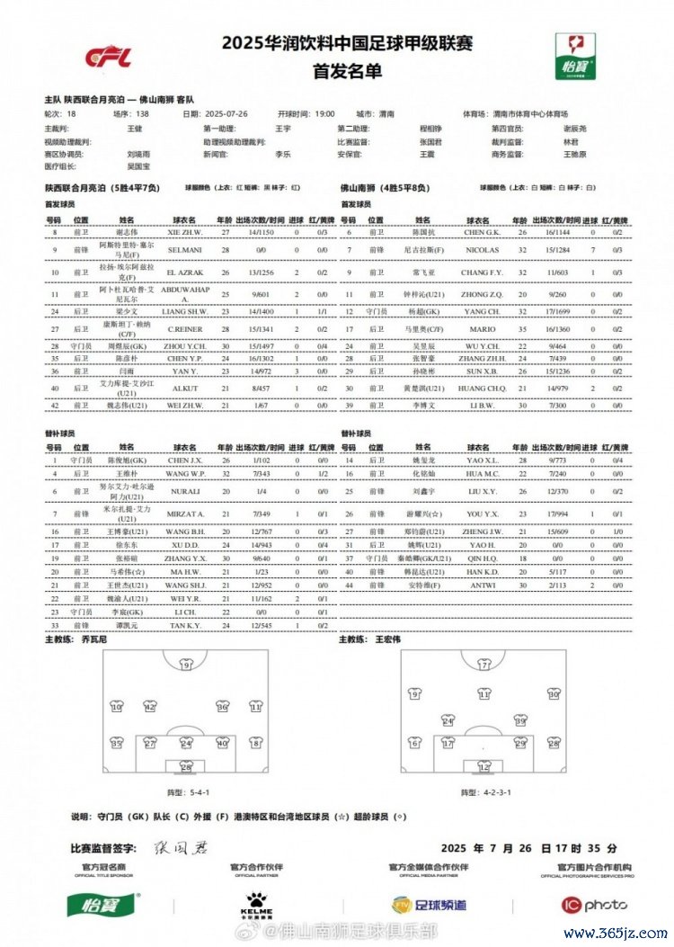 佛山南狮VS陕西聚首首发名单|2025华润饮料中甲联赛第18轮