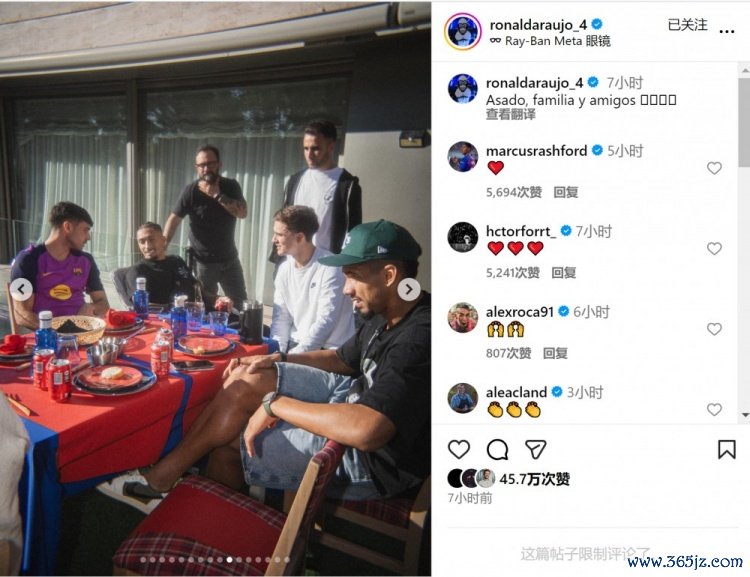 阿劳霍晒出与拉什福德、库巴西、卡萨多、巴尔德、加维、拉菲尼亚等队友约聚的像片,配文:“烧烤、家东说念主与一又友。”