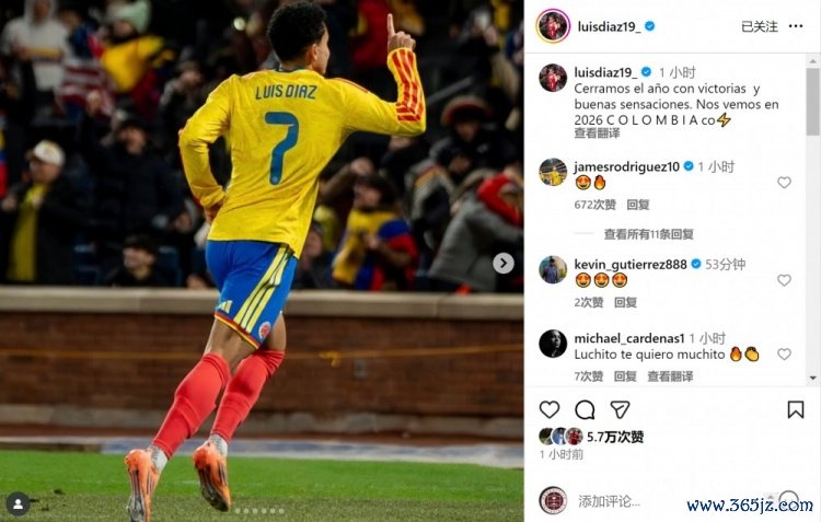 迪亚斯社媒晒出庆祝进球的相片,配文:“咱们以得胜和精巧的嗅觉为2025年收官,2026年见,哥伦比亚球迷们!”