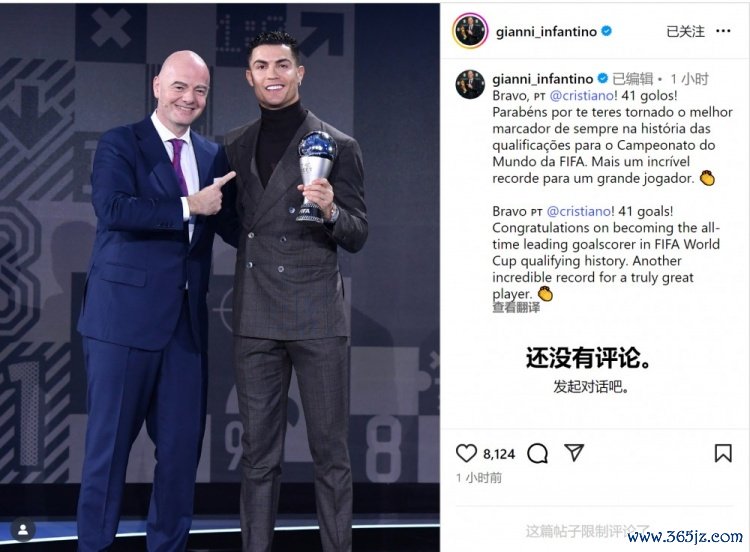 C罗奇迹活命于今世初赛打进41球,独享世初赛历史弓手王荣誉,海外足联主席因凡蒂诺社媒晒出与C罗的合照,对他暗示道贺。