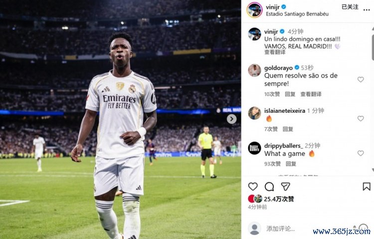维尼修斯赛后在个东谈主社媒晒出庆祝像片,配文写谈:“主场渡过好意思好的周日,皇马加油!”