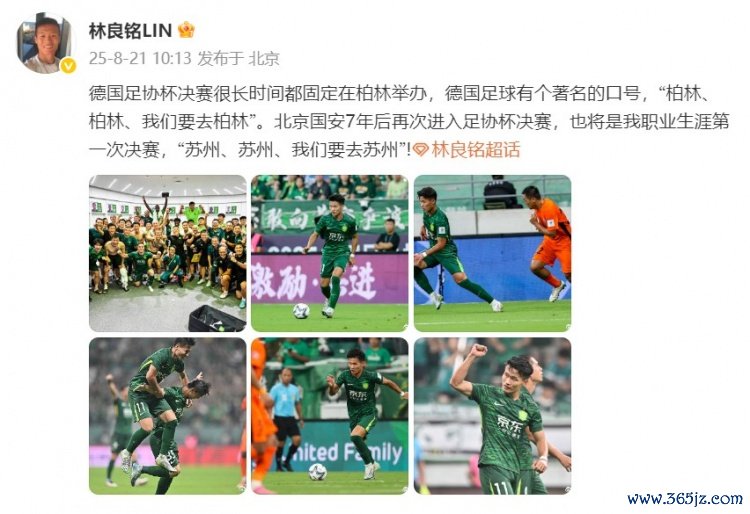 8月21日讯 足协杯半决赛,北京国安主场7-0大捷云南玉昆。赛后,国安球员林良铭更新了叮属媒体。