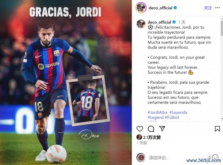 德科社媒晒出感谢阿尔巴的海报,配文:“恭喜,约迪,你渡过了精彩的劳动生活。你的‘足球遗产’将永存,祝明天赢得班师!”
