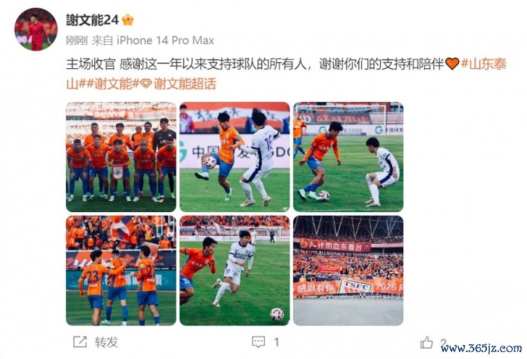 中超第29轮,泰山队主场2-1投诚津门虎,这亦然泰山队赛季主场收官战。赛后,谢文能更新社媒挂念,他写说念:主场收官 感谢这一年以来辅助球队的扫数东说念主,谢谢你们的辅助和跟随。