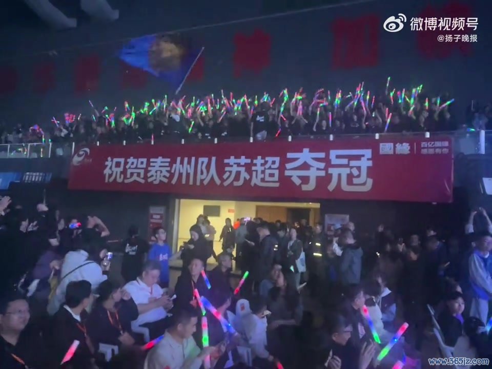 为庆祝顺利,市民夹说念迎接成功的泰州队队员,伴着《衷心英豪》歌曲旋律,泰州队员纷纷登台。