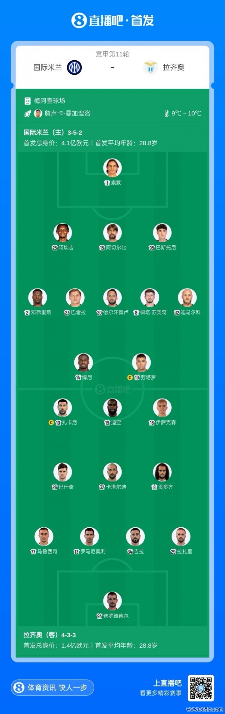 11月10日讯 意甲第11轮,国米主场迎战拉皆奥比赛行将打响。赛前首发出炉。