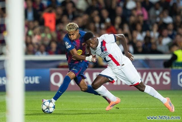 10月1日,巴塞罗那队球员亚马尔(左)和巴黎圣日尔曼队球员努诺·门德斯在比赛中拼抢。 新华社发