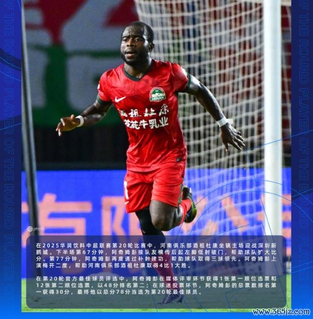 8月12日,中超官方公布第20轮最好球员,由河南队外助阿奇姆彭赢得。