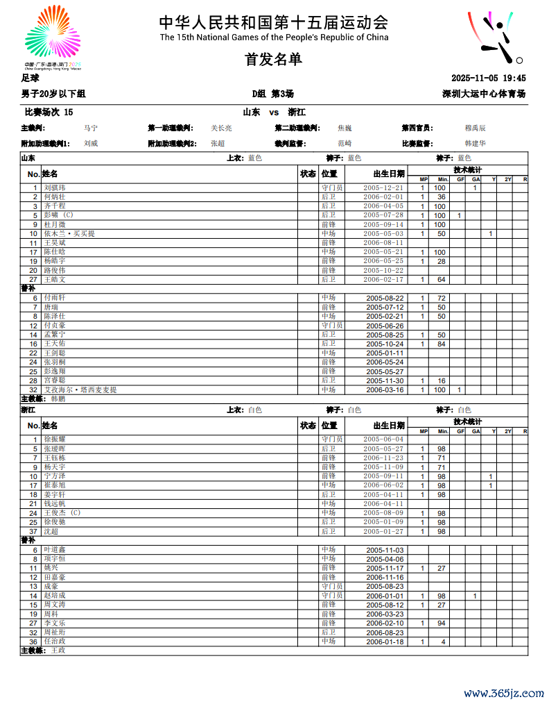浙江队主西宾王政安排王俊杰担任场上队长,徐振耀司职门将,王钰栋、张瑷晖、杨天宇、宁方泽、崔泰旭、姜宇轩、钱远帆、徐俊驰、沈超同期出战。